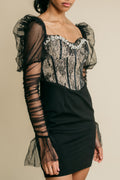 Tulle and corsetry never looked that good! Following the Regency-era-inspired trend that’s dominating 2022, this lace corset dress is shaping and sensual, yet absolutely comfortable. From weekend parties and dinners to New Year’s Eve, the sheer mesh sleeves add extra touches of dark allure to an already eye-catching look. The sweetheart neckline of the corset is lined with leaf-shaped rhinestones - proving yet again that crystals and lace are a match made in heaven. This statement piece with a truly feminine twist will look ah-mazing with a pair of crystal-adorned strappy heeled sandals or classic pumps and an updo or a low-twisted bun.