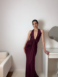 Crafted from ultra soft stretch fabric, it glides over the body with liquid smoothness while providing a secure, body-hugging fit. The floor-length drape adds a dramatic, red carpet finish elegant, minimal, and irresistibly bold.